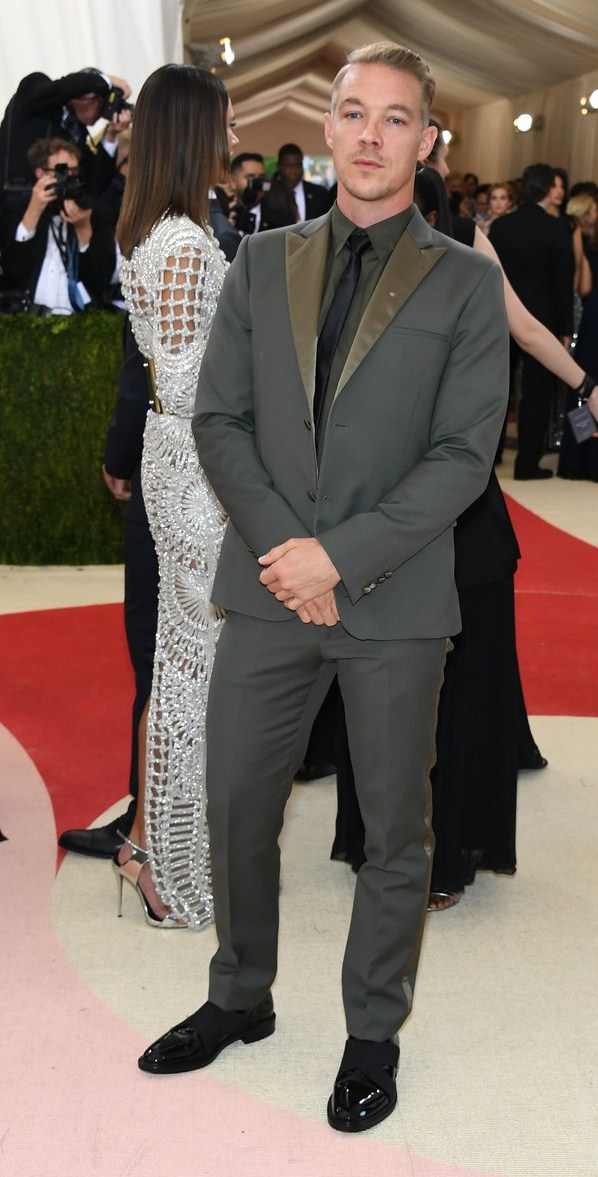 Diplo chose a dirty green Calvin Klein Collection cypress wool silk tuxedo, shirt and black satin tie.. and I kinda like it a lot!